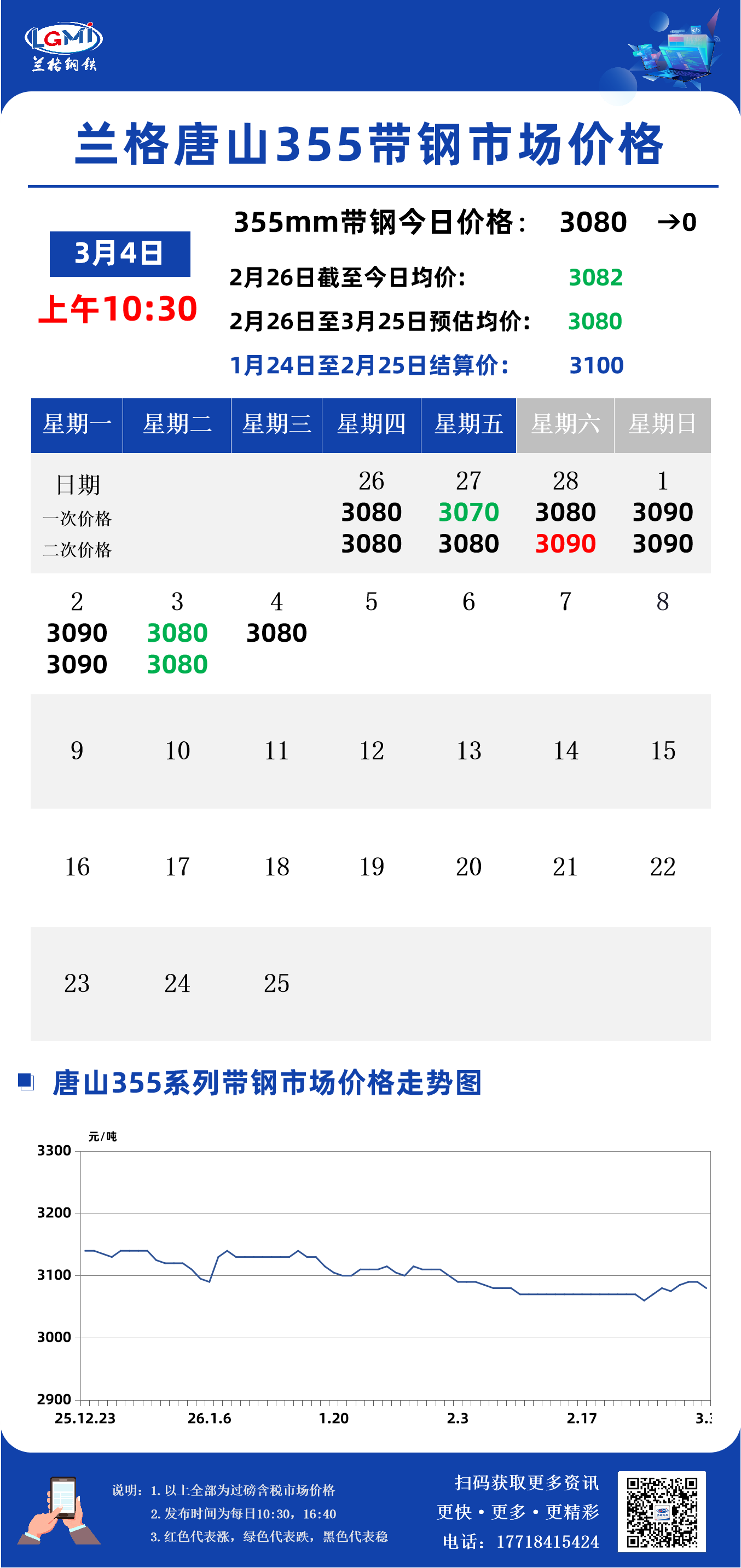 兰格钢铁云商平台监测数据显示,截至3月4日10:30,唐山地区355系列带钢市场价格为3080元,较昨市场收盘价格稳。