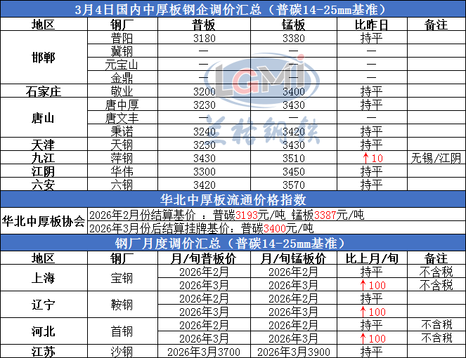 2026年3月4日国内中厚板钢企调价汇总