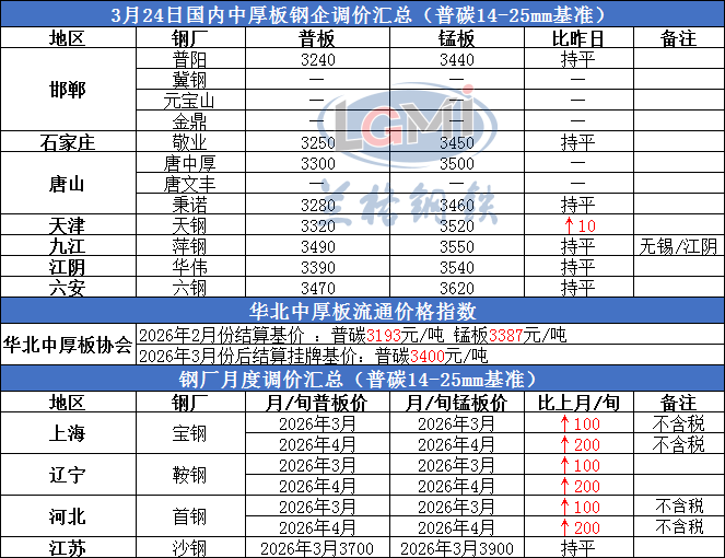 2026年3月24日国内中厚板钢企调价汇总