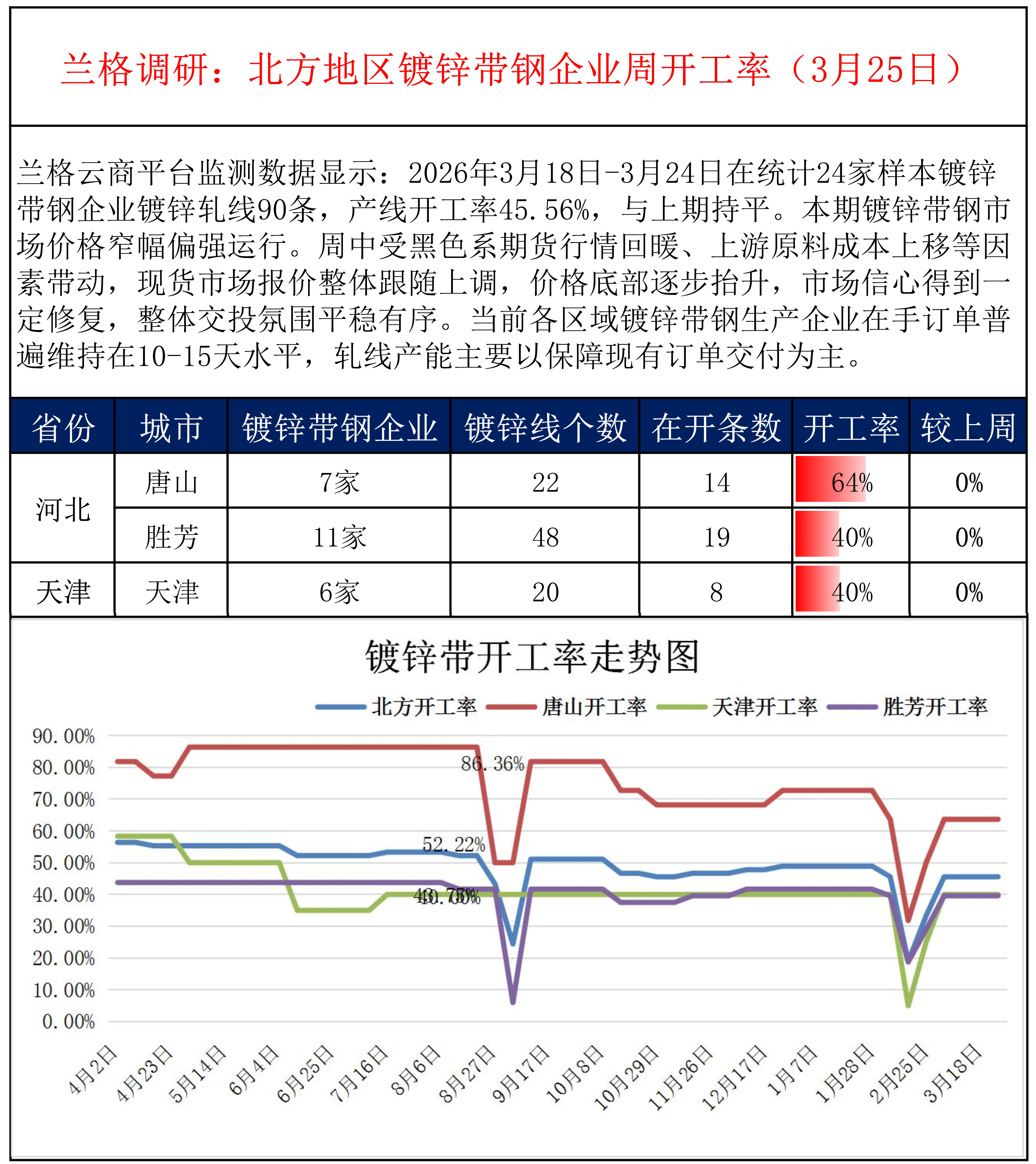 • 兰格调研:北方地区镀锌带钢企业周开工率(3月25日)