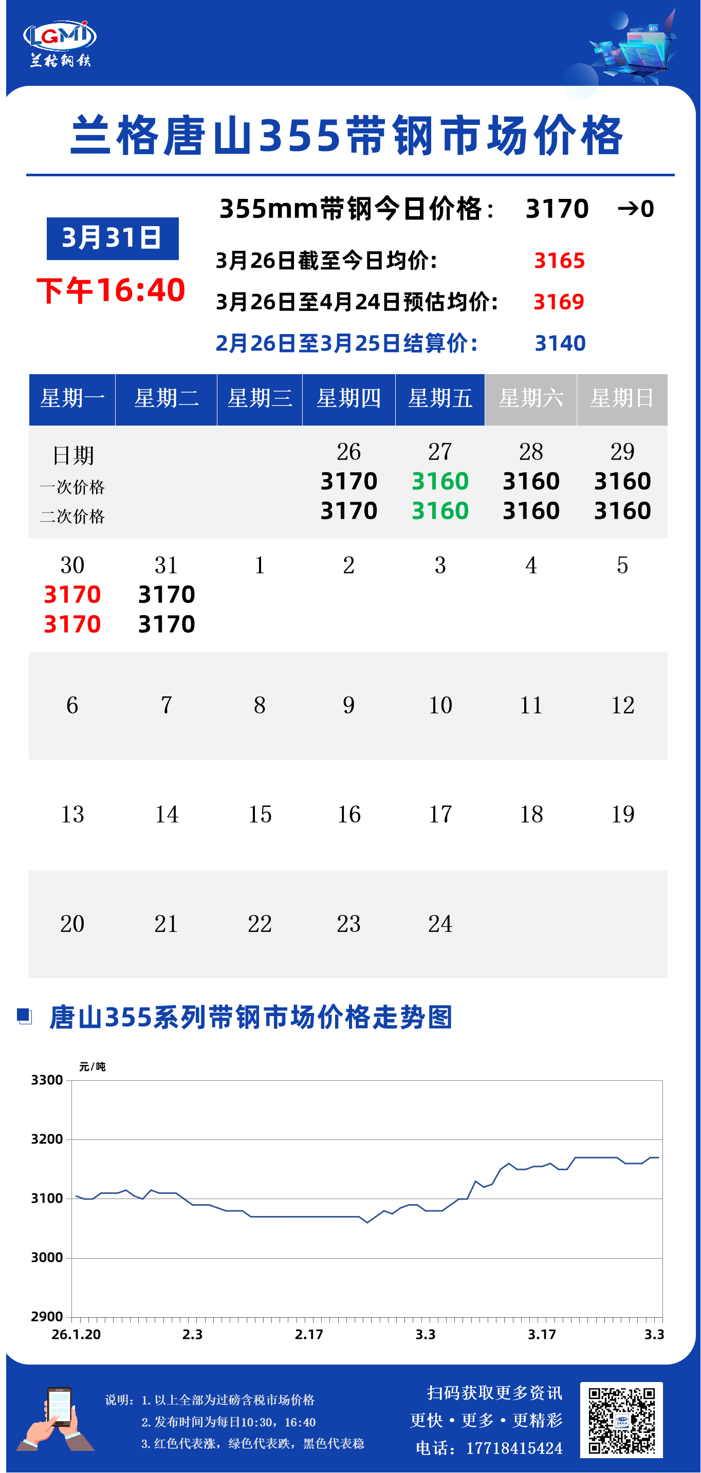 兰格钢铁云商平台监测数据显示,截至3月31日16:40,唐山地区355系列带钢市场价格为3170元,较昨日市场收盘价格稳。