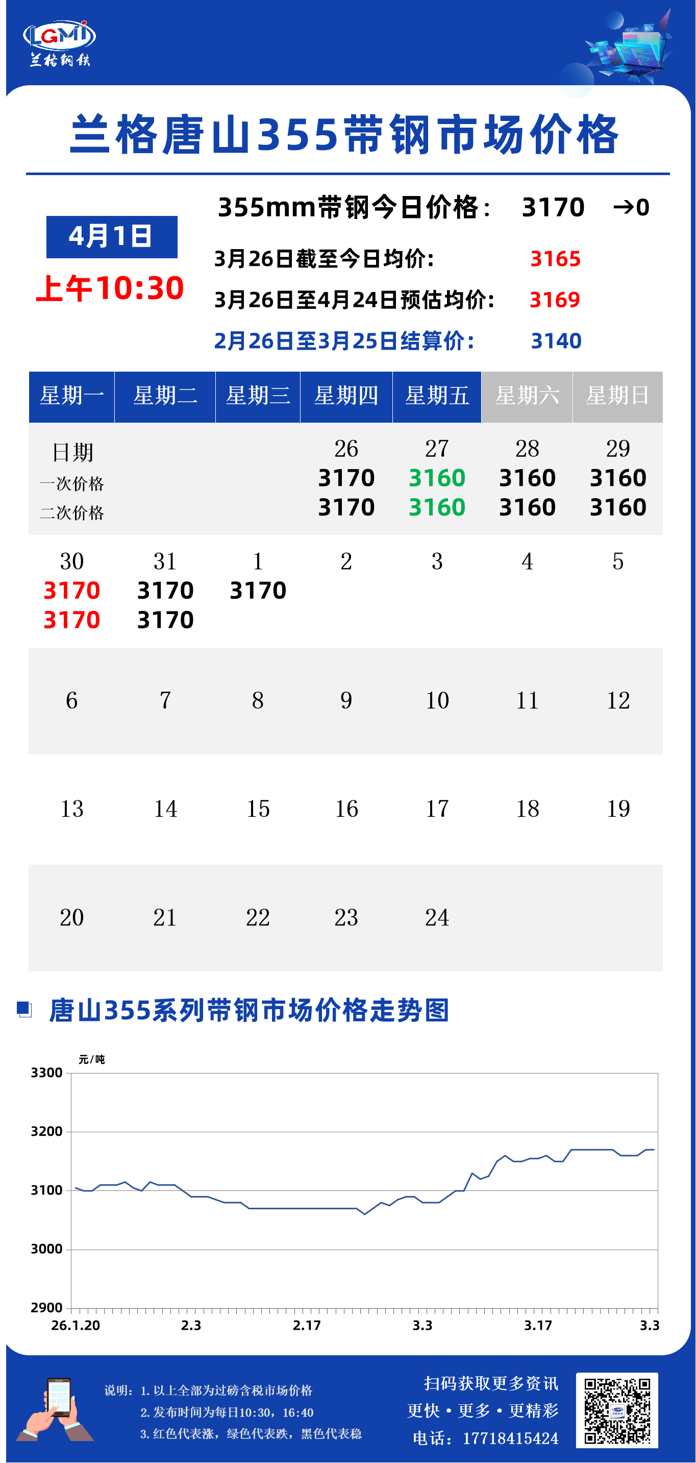兰格钢铁云商平台监测数据显示,截至4月1日10:30,唐山地区355系列带钢市场价格为3170元,较昨市场收盘价格稳。