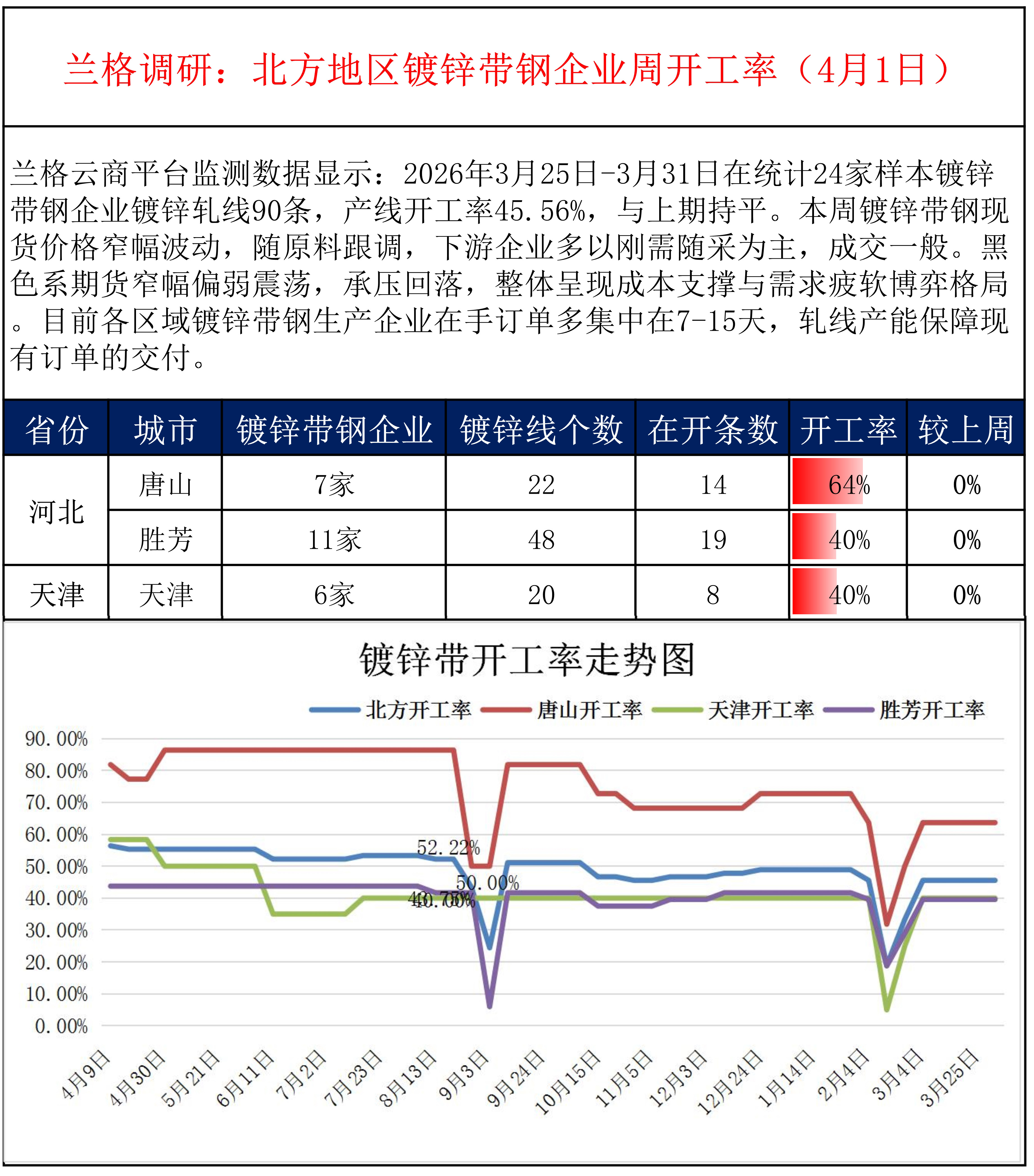 • 兰格调研:北方地区镀锌带钢企业周开工率(4月1日)
