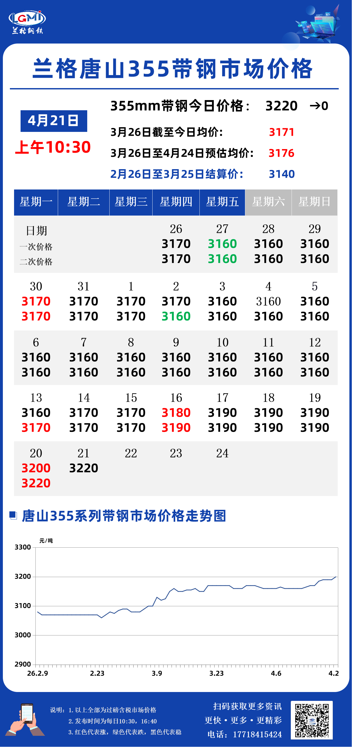 兰格钢铁云商平台监测数据显示,截至4月21日10:30,唐山地区355系列带钢市场价格为3220元,较昨市场收盘价格稳。