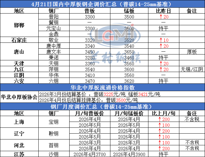• 2026年4月21日国内中厚板钢企调价汇总