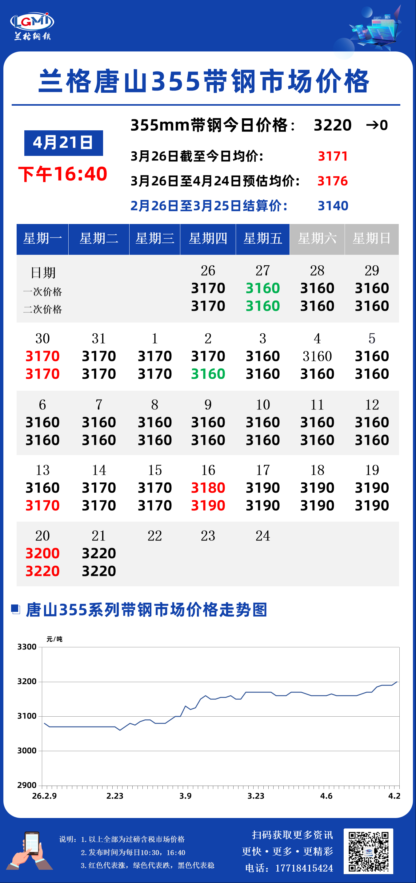 兰格钢铁云商平台监测数据显示,截至4月21日16:40,唐山地区355系列带钢市场价格为3220元,较昨市场收盘价格稳。