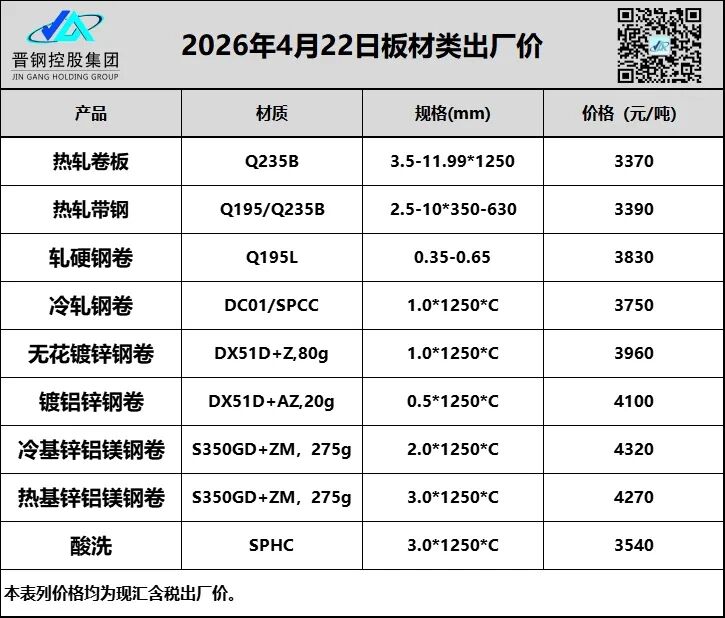 • 4月22日山西晋钢板材类出厂价格
