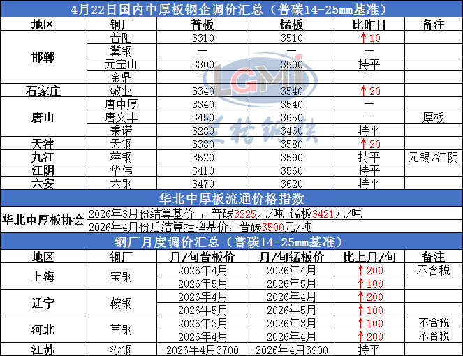 • 2026年4月22日国内中厚板钢企调价汇总