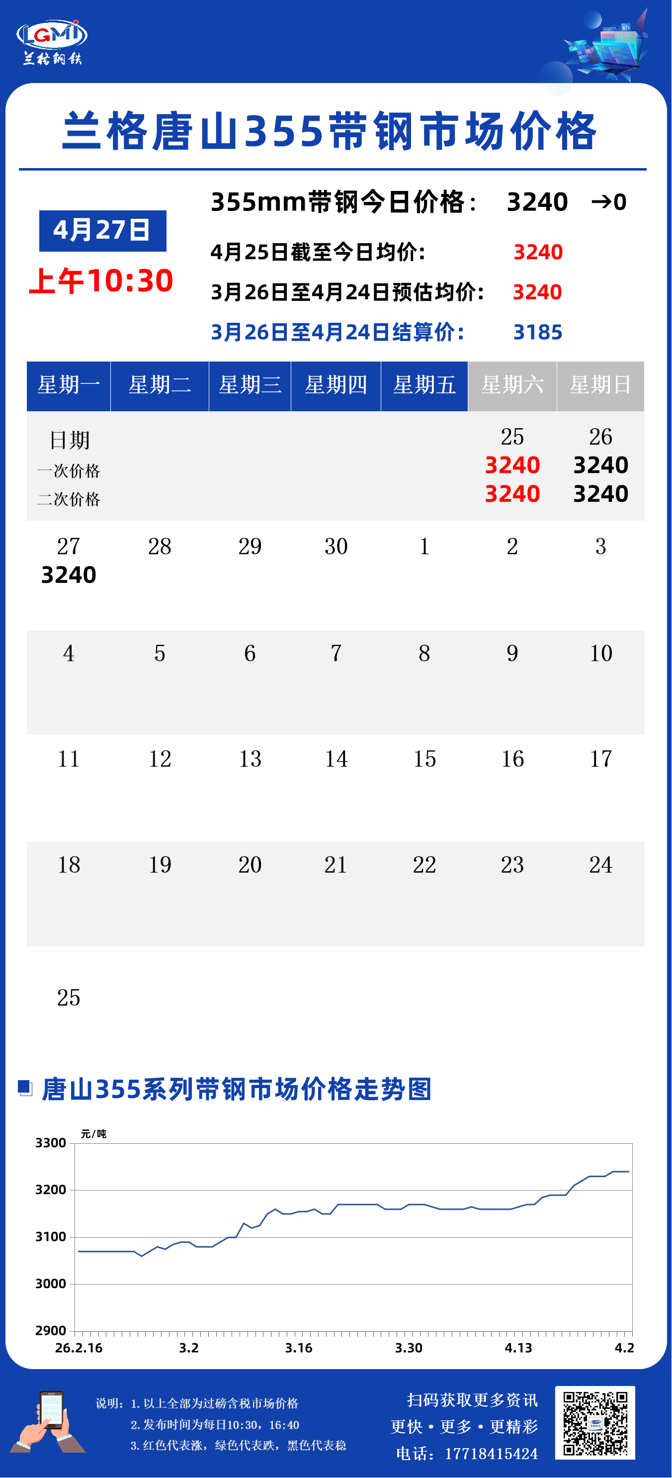 兰格钢铁云商平台监测数据显示,截至4月27日10:30,唐山地区355系列带钢市场价格为3240元,较昨市场收盘价格稳。