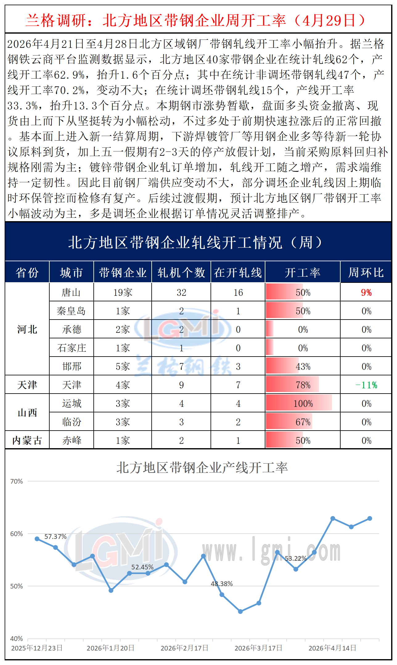 兰格调研:北方地区带钢企业周开工率(4月29日)