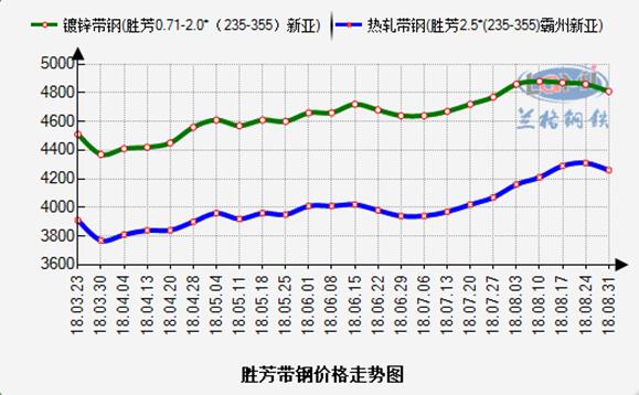 本周(8.27-8.31日)胜芳带钢持续持稳后跌落,据兰格钢铁网云商平台监测数据显示:截至31日,热轧带钢2.5mm*(235-355mm)出厂价执行4260元;2.5mm*(460-520mm)出厂价执行4270元,1.0*(235-355)镀锌带钢新亚含税出厂4810元,相比同期均跌50。