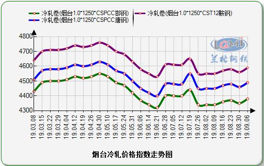 本周烟台冷轧价格小幅上涨。据兰格钢铁云商平台监测数据显示:目前市场主流冷轧板卷价格,邯钢1.0*1250*C的价格为元4380元/吨,唐钢1.0*1250*C的价格为4490元/吨,较上周涨30元。