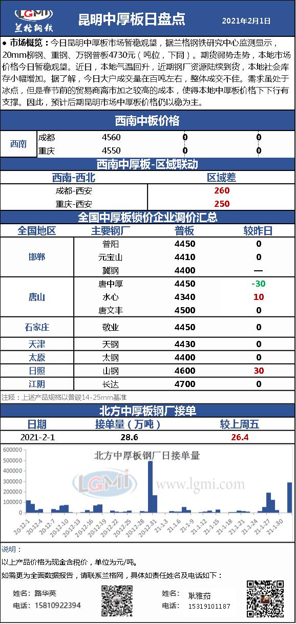 - 2月1日昆明中厚板市场价格暂稳观望 市场清淡2021/2/1