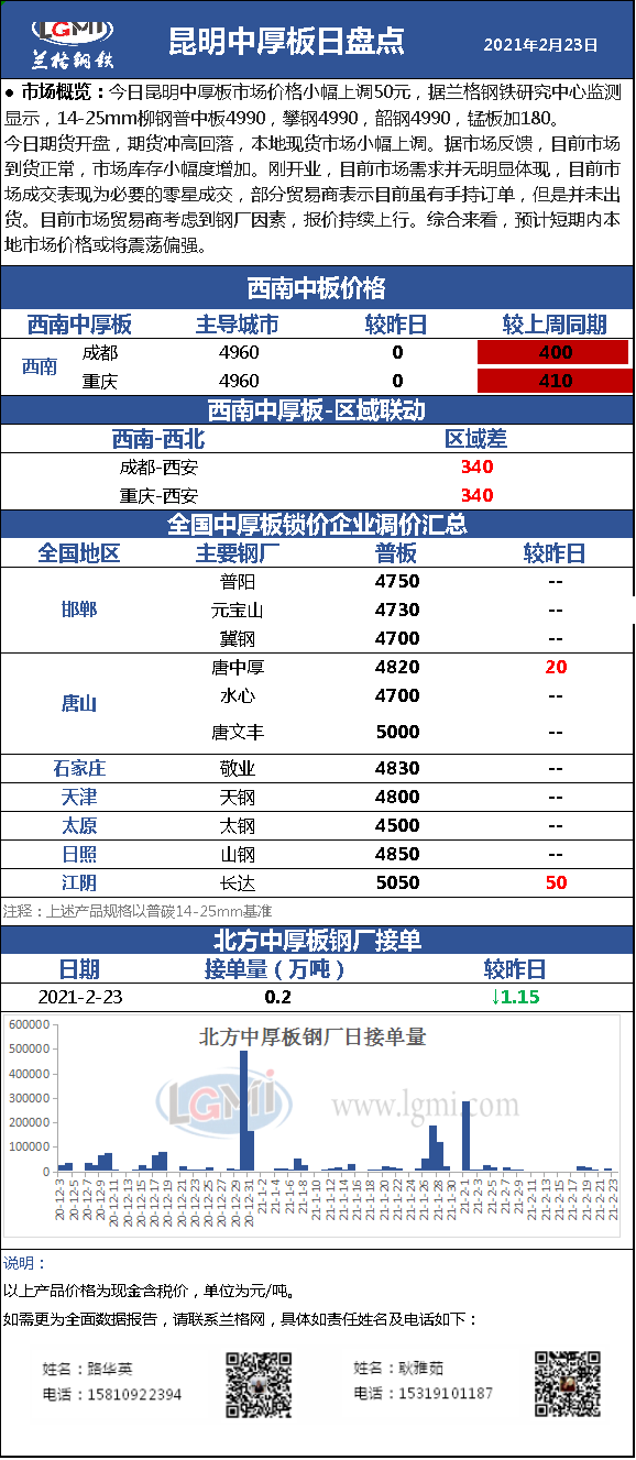 - 2月23日昆明中厚板市场价格小幅上调 成交平平2021/2/23