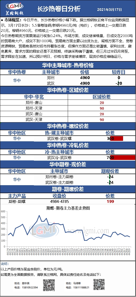 - 3月17日长沙热卷小幅下跌 预计明日维稳运行2021/3/17
