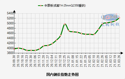 本周成都中厚板市场价格以稳为主,据兰格钢铁云商平台监测数据显示,本周(3.22-3.26日)14-20mm普板重钢均价5188元。