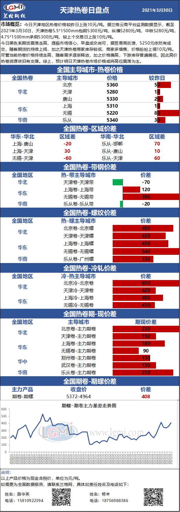 - 3.30日天津热卷价格小幅上涨 明日或将持续高位盘整2021/3/30