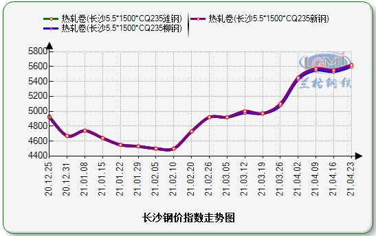 本周长沙热卷市场价格明显上涨。据兰格云商平台监测数据显示,截至到4月23日,长沙热卷涟钢5.5*1500普卷5620元(吨价,下同),新钢5.5mm普卷5620元,柳钢5.5mm普卷5600元。较上周五涨70元。