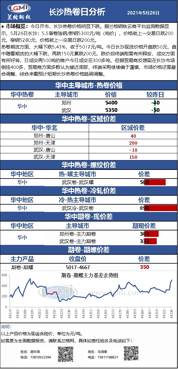 - 5月26日长沙热卷价格大幅下跌 预计短期趋弱调整2021/5/26