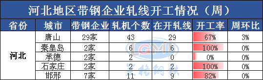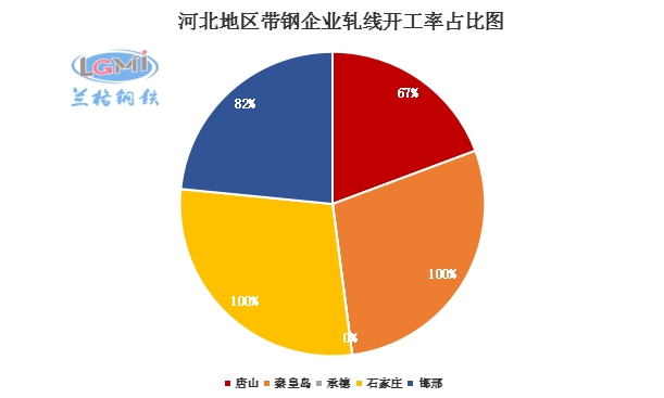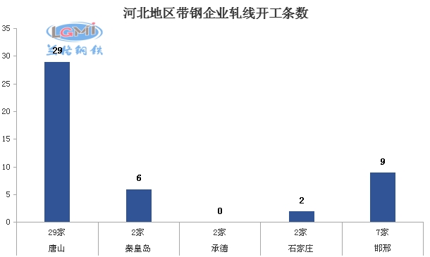 据兰格云商调研监测:本周五(8月27日)兰格网对河北地区42家带钢企业进行了开工情况调查,调查显示,河北地区带钢轧机共有65个,本周在开工轧线44条,较上周增加1条,开工率为71%,较上周环比增加2%。其中唐山地区有轧机44个,本周在开工轧线29条,较上周增加2条,开工率为66%,较上周环比增加3%。邯邢地区有轧机11个,本周在开工轧线9条,本周开工率为82%,较上周持平。秦皇岛地区开工率为100%,与上周持平,承德、石家庄地区轧机有4个,本周在开2条,较上周持平。