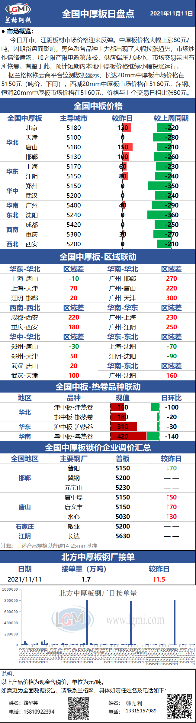 - 兰格中厚板日盘点(11.11):现货报价止跌探涨 下游企业部分补库 接单情况好转2021/11/11