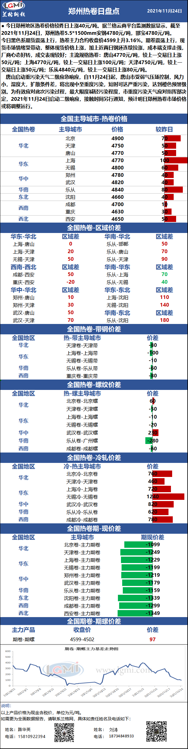 - 兰格热卷日盘点(11.24):今日国内热卷价格普遍上调 市场成交氛围有所改善2021/11/24