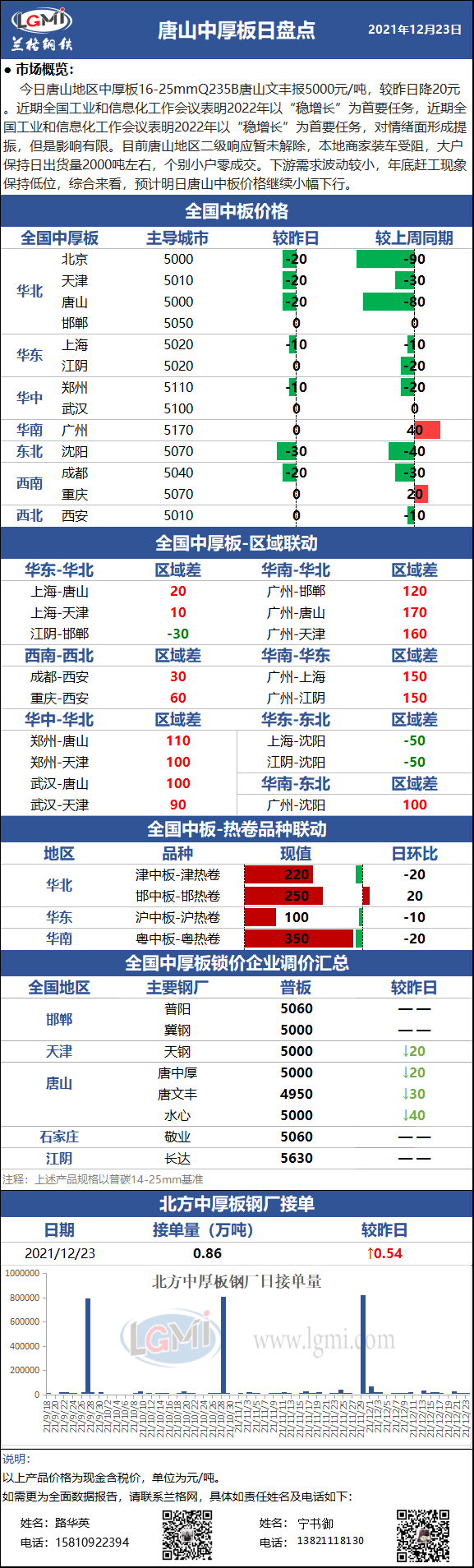12月23日唐山中厚板市场弱势运行 预计明日继续小幅下行
