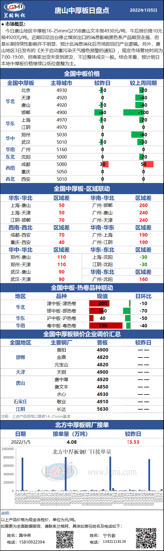 1月5日唐山中厚板市场成交一般 预计明日市场继续盘整为主