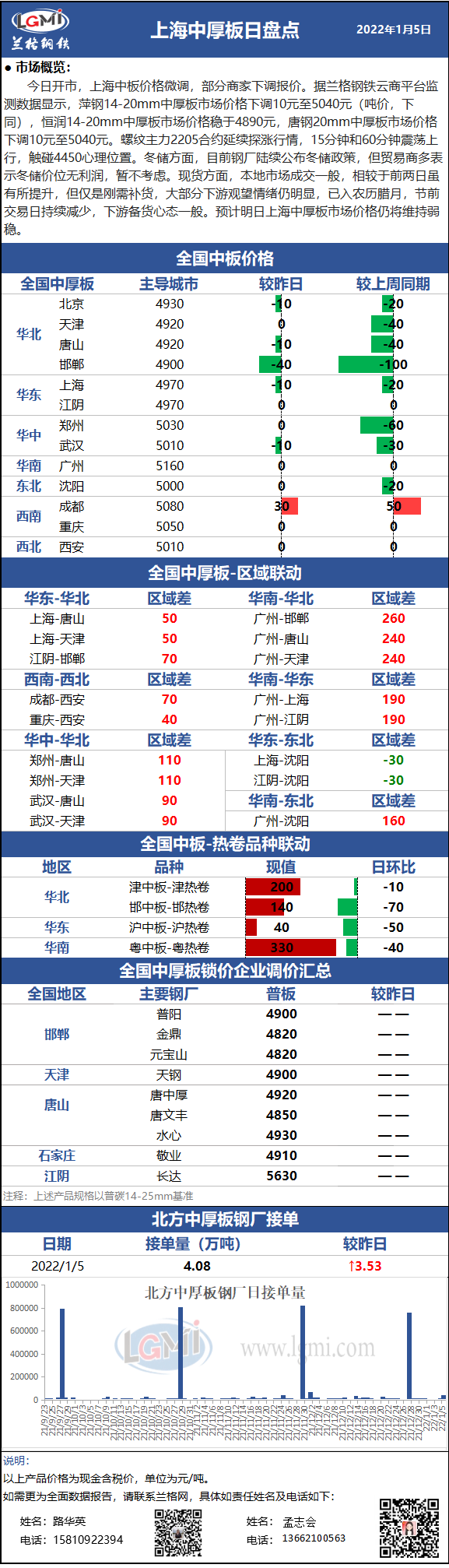 - 1月5日上海中厚板价格微调 下游需求偏淡2022/1/5