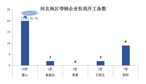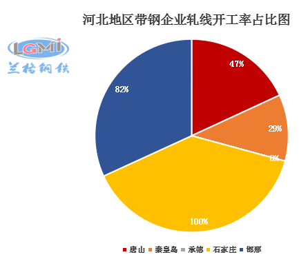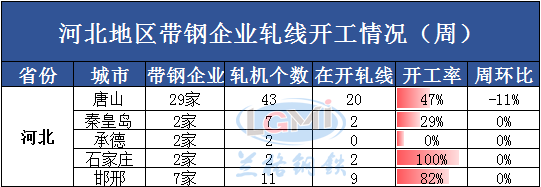 据兰格云商调研监测:本周(6月24日)兰格网对河北地区42家带钢企业进行了开工情况调查,调查显示,河北地区带钢轧机共有65个,本周在开工轧线33条,开工率为51%,较上周下降4个百分点。其中唐山地区有轧机43个,本周在开工轧线20条,开工率为47%,较上周下降11个百分点。邯邢地区有轧机11个,本周在开工轧线9条,本周开工率为82%,较上周持平。秦皇岛地区开工率为29%,较上周持平。承德、石家庄地区轧机有4个,本周在开2条,较上周持平。