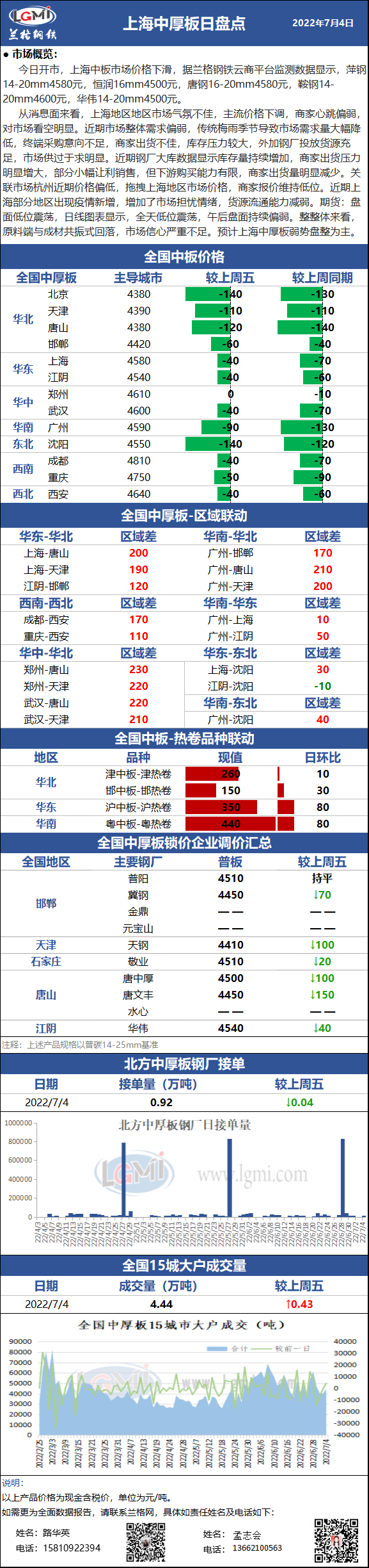 - 7月4日全国15个重点城市中厚板样本大户出货量2022/7/4