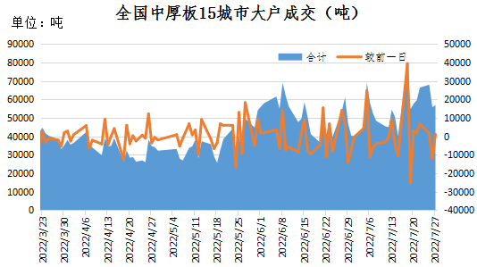 据兰格钢铁云商平台监测数据显示,7月27日全国15个重点城市中厚板大户日出货量约为56980吨,较昨日增加1125吨左右,其中北方区域邯郸中厚板大户出货量约为9640吨,较昨日减少410吨左右,南方区域江阴中厚板大户出货量约为11700吨,较昨日增加200吨左右,据了解,目前个别区域规格断档情况比较严重,有限的资源相对限制了需求明显释放的可能,加之期货市场宽幅震荡,终端用户补库意愿不强,今日市场成交氛围较昨日没有明显改善。