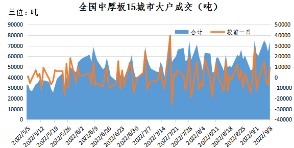 据兰格钢铁云商平台监测数据显示,9月8日全国15个重点城市中厚板大户日出货量约为74025吨,较上一交易日增加9285吨左右,其中北方区域邯郸中厚板大户出货量约为13160吨,较上一交易日增加3560吨左右,南方区域江阴中厚板大户出货量约为14400吨,较上一交易日小幅增加1500吨左右,今日期货市场震荡趋强,加之临近中秋小长假,部分终端企业节前备货。