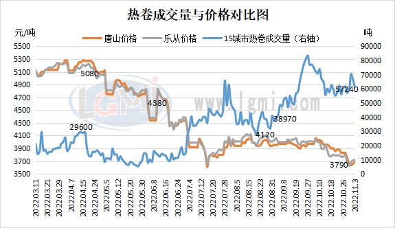 据兰格钢铁云商平台监测数据显示,11月3日全国16个重点城市热轧板卷大户日出货量约为60310吨,较上一交易日减少5850吨,其中北方区域唐山热轧板卷大户出货量约为5600吨,较上一交易日下降350吨左右,南方区域乐从热轧板卷大户出货量约为10740吨,较上一交易日减少1010吨。虽热卷期货盘面延续涨势,但现货市场价格波动有限,业者补货暂时告一段落,市场交投继续转弱。
