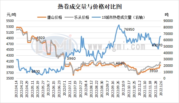 据兰格钢铁云商平台监测数据显示,12月6日全国16个重点城市热轧板卷大户日出货量约为65990吨,较上一交易日增加850吨。其中北方区域唐山热轧板卷大户出货量约为4860吨,较上一交易日增加210吨;南方区域乐从热轧板卷市场大户出货量约为4600吨,较上一交易日增加640吨。热卷期货盘面弱势向下,热卷市场整体购销表现一般,下游多按自身节奏入市采购。受部分区域解封,热卷市场恢复正常购销影响,今日热卷市场成交量较昨日小幅增加。