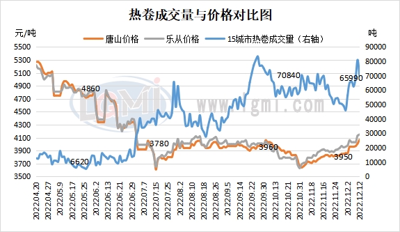 据兰格钢铁云商平台监测数据显示,12月12日全国16个重点城市热轧板卷大户日出货量约为69600吨,较上一交易日下降11370吨。其中北方区域唐山热轧板卷大户出货量约为4690吨,较上一交易日下降1040吨;南方区域乐从热轧板卷市场大户出货量约为4630吨,较上一交易日减少410吨。热卷市场成交价格普遍上推,但期货盘面上涨动力减弱,经过补货之后市场业者入市采购放缓,今日热卷市场成交量有所下降。