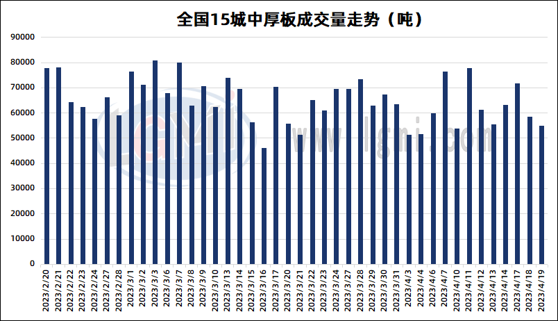 据兰格钢铁云商平台监测数据显示,4月19日全国15个重点城市中厚板大户日出货量约为54990吨,较上个成交日减少3460吨,其中北方区域邯郸中厚板大户出货量约10270吨,较上个成交日增加1350吨,南方区域江阴中厚板大户出货量约为8100吨,较上个成交日减少2800吨;今日期货盘弱势震荡,现货商家心态偏空,中厚板买方接单意向不足,多以询盘为主,交投氛围欠佳。
