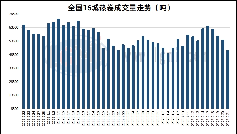 据兰格钢铁云商平台监测数据显示,4月21日全国16个重点城市热轧板卷大户日出货量约为46480吨,较昨日下降7900吨。其中北方区域邯郸山热轧板卷大户出货量约为3760吨,较昨日下降600吨;南方区域乐从热轧板卷市场大户出货量约为3090吨,较昨日下降490吨。热卷期货跌势拉阔,业者对于后市行情信心不足多观望为主,热卷市场成交量继续下降。