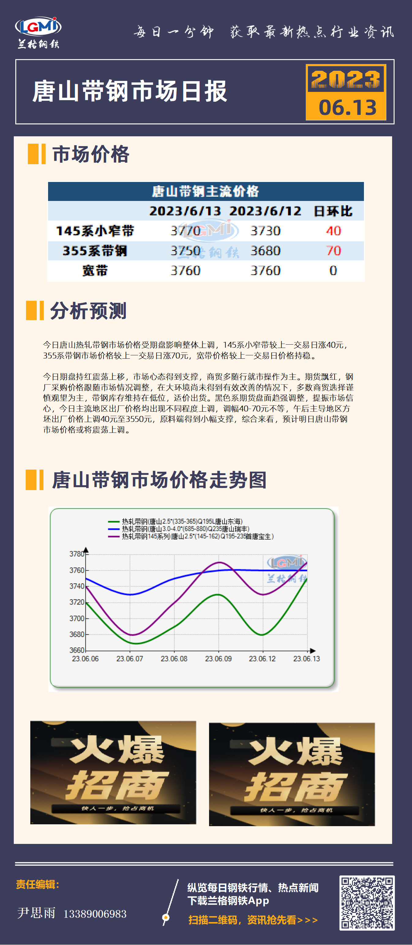 - 调价:6月13日唐山带钢天物顺通145-235系出厂价格再涨10元2023/6/13