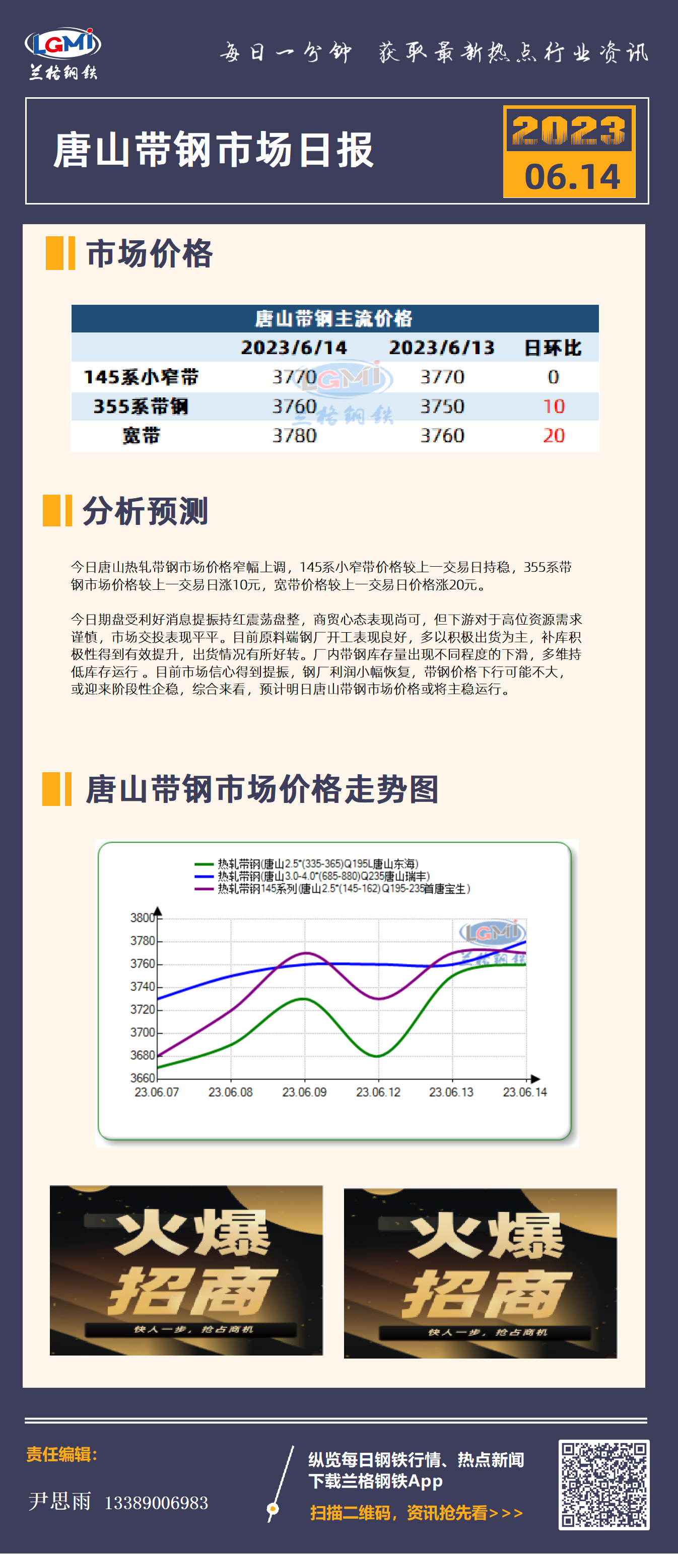 - 调价:6月14日唐山东海带钢出厂价格涨10元2023/6/14