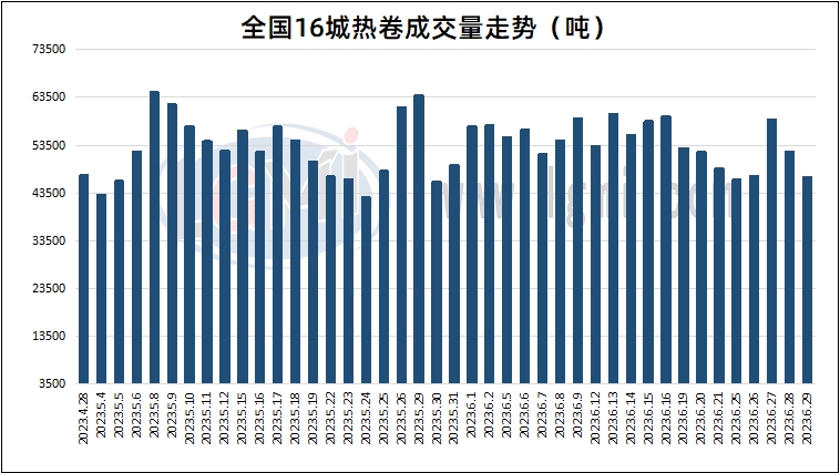 据兰格钢铁云商平台监测数据显示,6月29日全国16个重点城市热轧板卷大户日出货量约为46750吨,较昨日下降5310吨。其中北方区域唐山区域热轧板卷大户出货量约为3510吨,较昨日下降1670吨;南方区域杭州热轧板卷市场大户出货量约为6200吨,较昨日下降1100吨。热卷期货盘面围绕3800关口震荡运行,热卷市场整体购销僵持,今日市场成交量较昨日继续下滑。