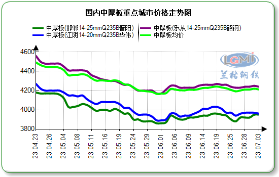 7月3日国内中厚板市场价格部分下调,幅度在10-20元不等。据兰格云商平台监测数据显示,国内重点城市16-25mm普板平均价格为4068元,较上个成交日降1元,较上周同期涨27元。