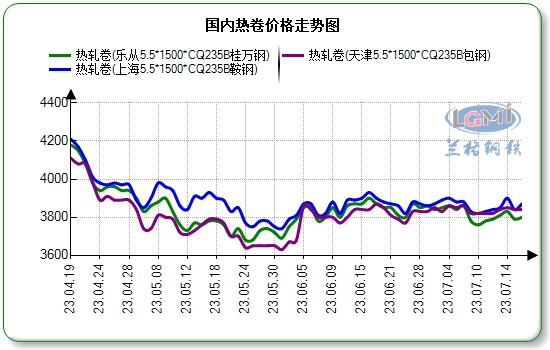 据兰格钢铁网数据显示,截止到7月18日,以重点城市天津、上海、乐从市场主流价格为例,7月份天津市场包钢均价为3838元(吨价,下同),较6月同期上涨42元;上海市场鞍钢均价3859元,较6月同期上涨2元;乐从市场桂万钢均价3813元,下跌19元。整体来看,本月热卷价格波动幅度收窄,现货价格的最大价差仅60元/吨。