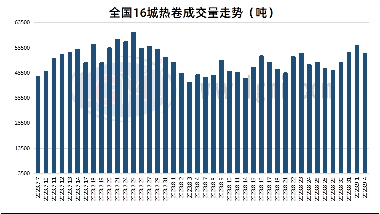 据兰格钢铁云商平台监测数据显示,9月4日全国16个重点城市热轧板卷大户日出货量约为51280吨,较上周五增加3070吨。其中北方区域唐山热轧板卷大户出货量约为6220吨,较昨日下降1180吨;南方区域杭州热轧板卷市场大户出货量约为6500吨,较上周五下降300吨。热卷市场成交价格窄幅上调,下游以及终端采购按需为主,今日热卷大户出货量有所下降。