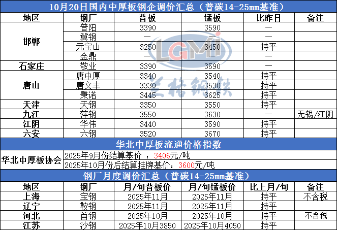• 2025年10月20日国内中厚板钢企调价汇总
